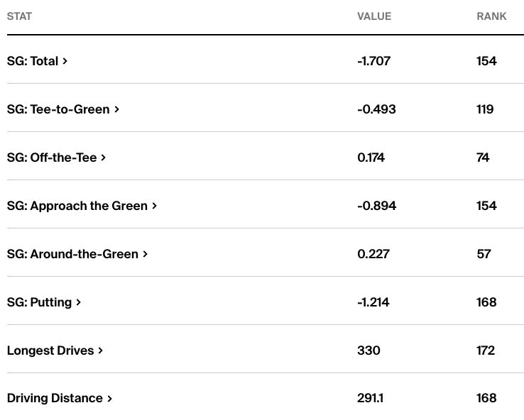 Then there’s Chatfield’s putting. He’s not 3-putting, but he’s also making many of his first putts either, which puts him near the bottom of the tour in SG: Putting.