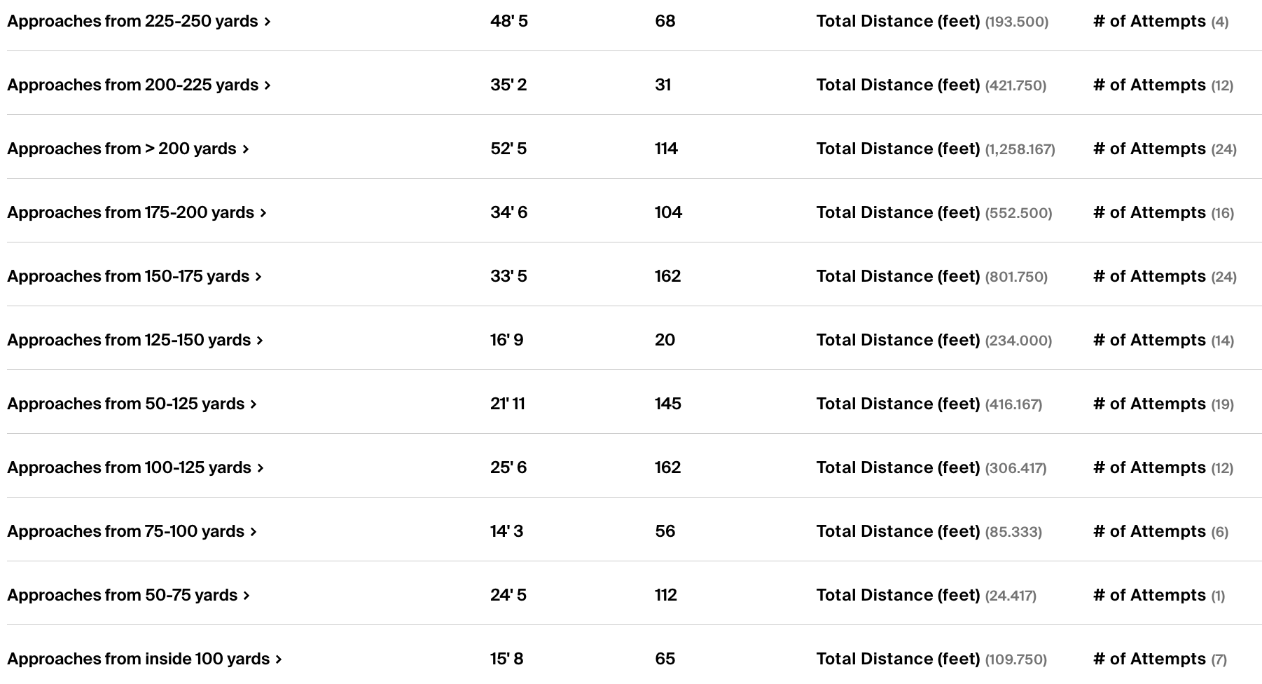 The breakdown of approach ranking by yardage is fascinating, too, and will probably be something worth following for Chatfield over the course of the year. He’ll have longer shots into greens on average, but he’s been okay from 125-150 yards and from 200-225 yards!