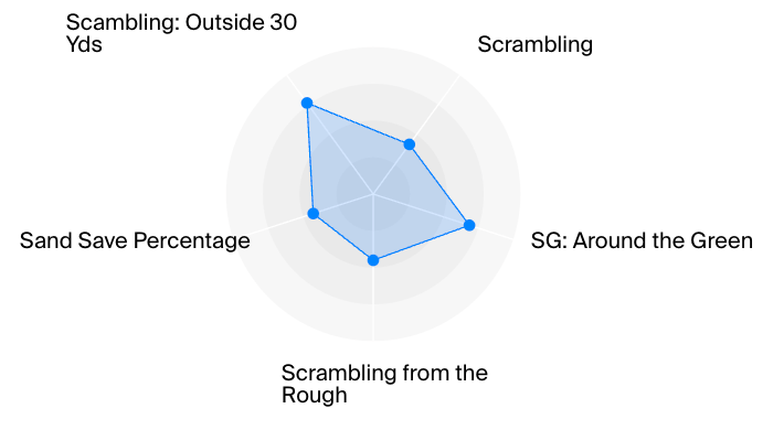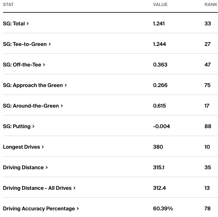 Okay, then we can look at his scrambling when he does miss greens. He’s ranked 57th in SG: Around the Green, and he’s pretty solid from outside 30 yards, but that’s no way to make a living.